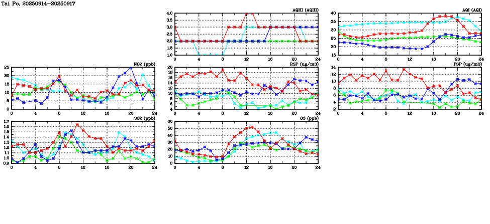 Air Quality Data Time Series in Tai Po (2025/09/17) | ( Line colors: Day -3 Day -2 Day -1 Current day ) | 2D Map Current AQHI |