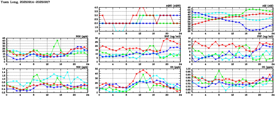 Air Quality Data Time Series in Yuen Long (2025/09/17) | ( Line colors: Day -3 Day -2 Day -1 Current day ) | 2D Map Current AQHI |