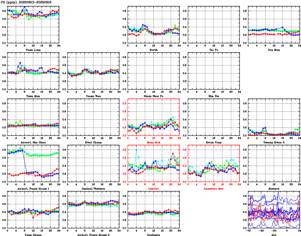 Air Quality Data Time Series for CO (2025/09/16) | ( Line colors: Day -3 Day -2 Day -1 Current day ) | 2D Map Current AQHI |