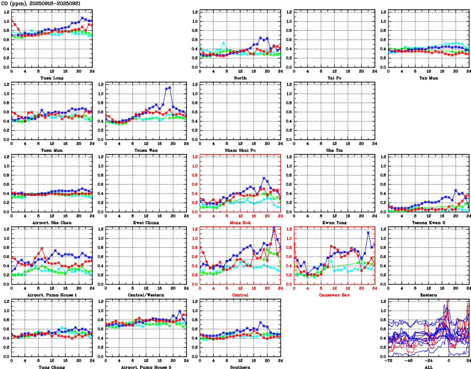 Air Quality Data Time Series for CO (2025/09/21) | ( Line colors: Day -3 Day -2 Day -1 Current day ) | 2D Map Current AQHI |