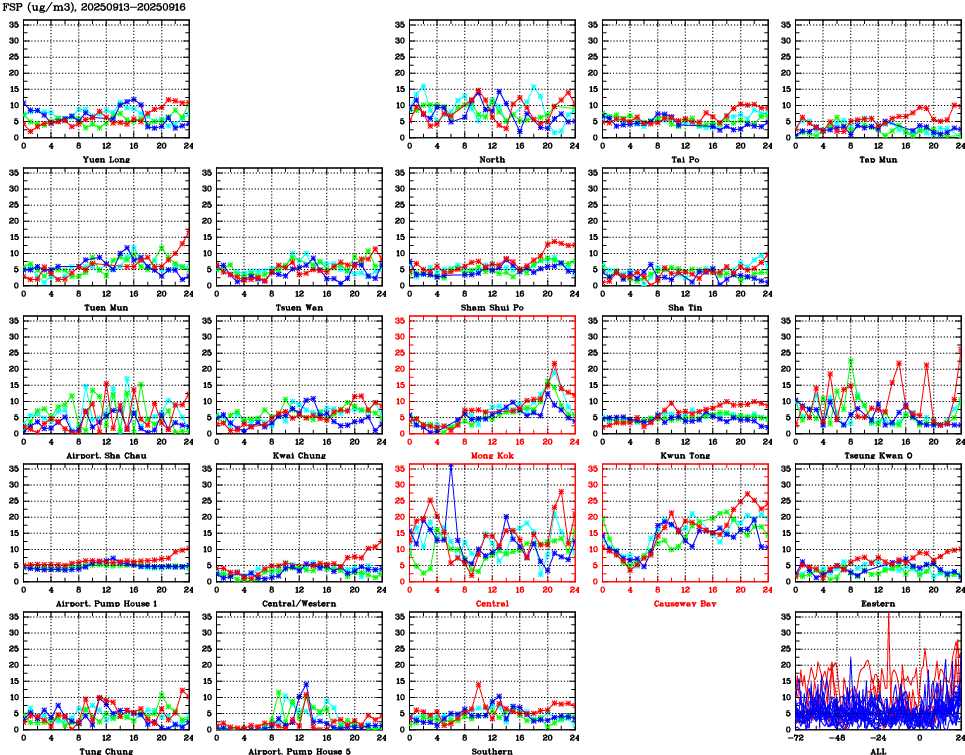 Air Quality Data Time Series for FSP (2025/09/16) | ( Line colors: Day -3 Day -2 Day -1 Current day ) | 2D Map Current AQHI |