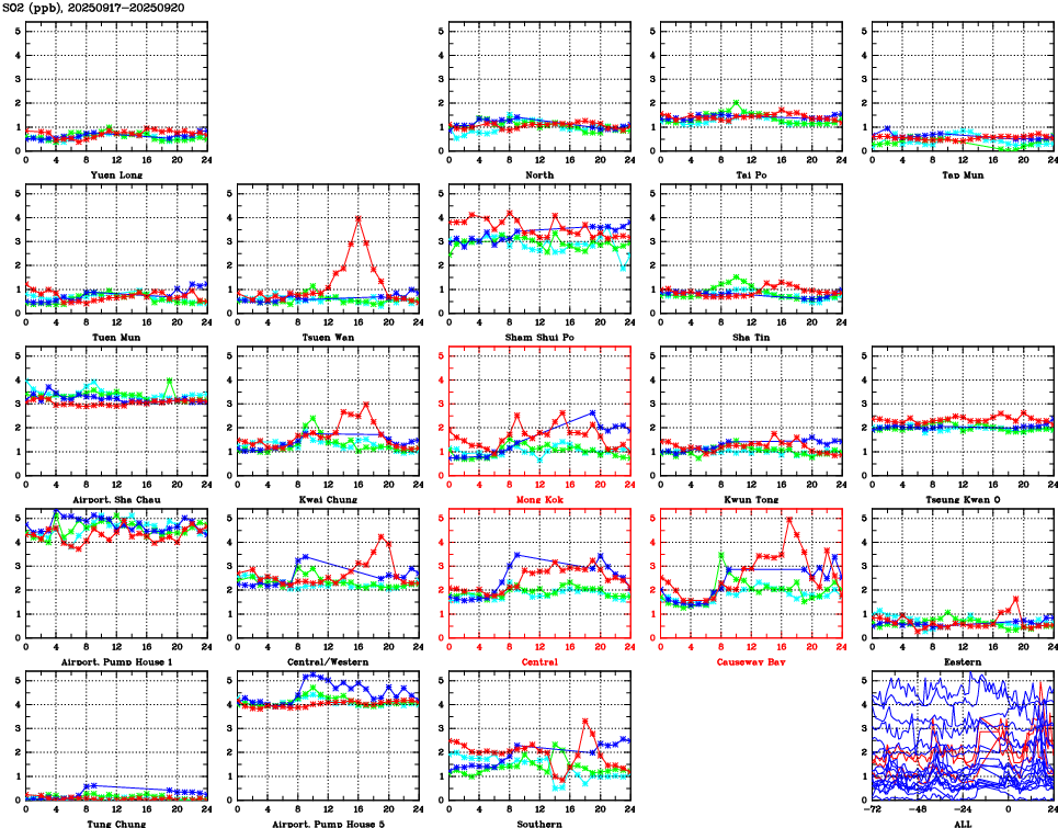 Air Quality Data Time Series for SO2 (2025/09/20) | ( Line colors: Day -3 Day -2 Day -1 Current day ) | 2D Map Current AQHI |