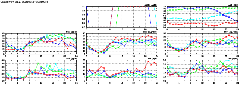 Parameters: | AQHI | AQI | RSP | FSP | NO2 | SO2 | O3 | CO | Temp | WS | WD |