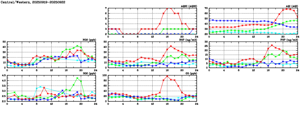 Air Quality Data Time Series in Central/Western (2025/09/22) | ( Line colors: Day -3 Day -2 Day -1 Current day ) | 2D Map Current AQHI |