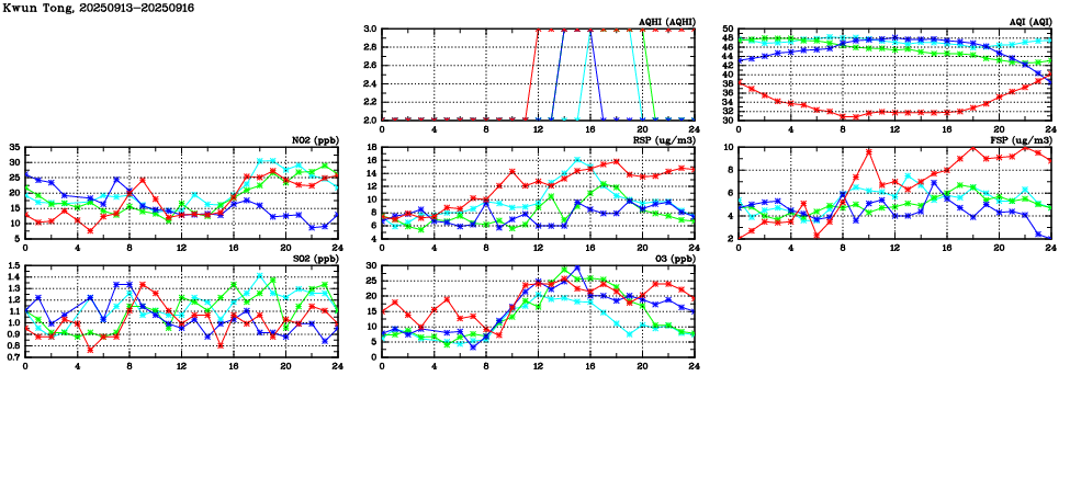 Air Quality Data Time Series in Kwun Tong (2025/09/16) | ( Line colors: Day -3 Day -2 Day -1 Current day ) | 2D Map Current AQHI |