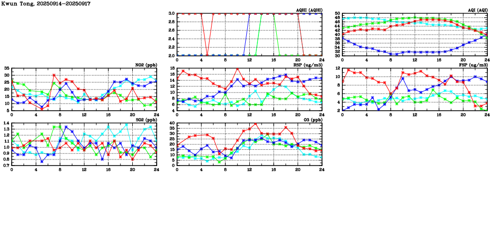 Air Quality Data Time Series in Kwun Tong (2025/09/17) | ( Line colors: Day -3 Day -2 Day -1 Current day ) | 2D Map Current AQHI |
