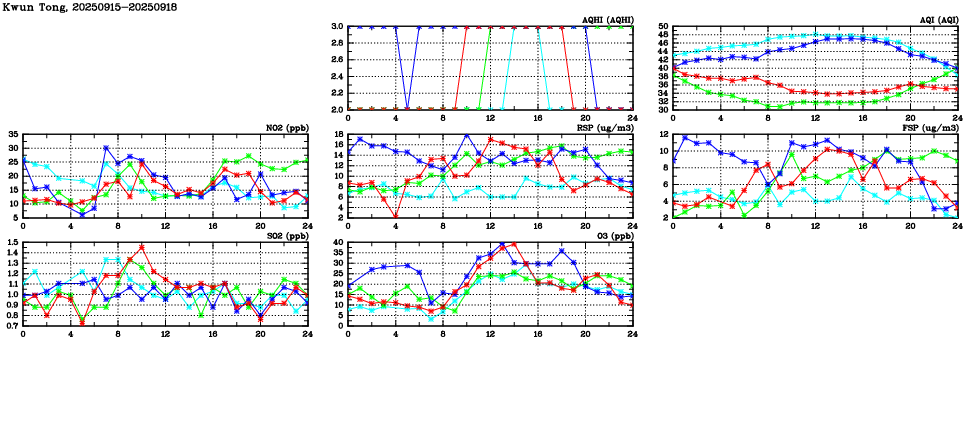 Air Quality Data Time Series in Kwun Tong (2025/09/18) | ( Line colors: Day -3 Day -2 Day -1 Current day ) | 2D Map Current AQHI |