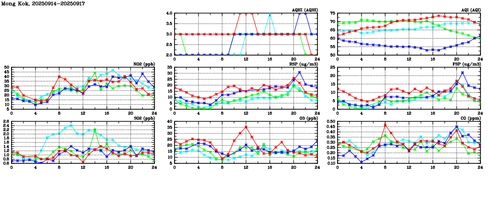 Parameters: | AQHI | AQI | RSP | FSP | NO2 | SO2 | O3 | CO | Temp | WS | WD |