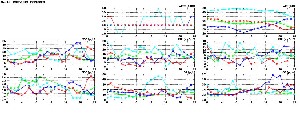 Air Quality Data Time Series in North (2025/09/21) | ( Line colors: Day -3 Day -2 Day -1 Current day ) | 2D Map Current AQHI |