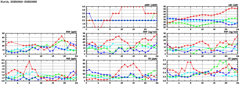 Air Quality Data Time Series in North (2025/09/22) | ( Line colors: Day -3 Day -2 Day -1 Current day ) | 2D Map Current AQHI |