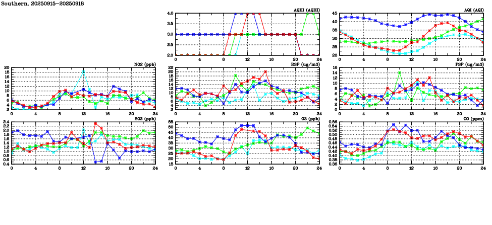 Air Quality Data Time Series in Southern (2025/09/18) | ( Line colors: Day -3 Day -2 Day -1 Current day ) | 2D Map Current AQHI |