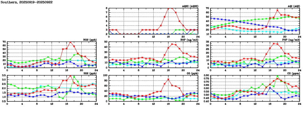 Air Quality Data Time Series in Southern (2025/09/22) | ( Line colors: Day -3 Day -2 Day -1 Current day ) | 2D Map Current AQHI |