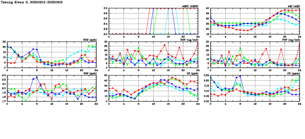 Air Quality Data Time Series in Tseung Kwan O (2025/09/16) | ( Line colors: Day -3 Day -2 Day -1 Current day ) | 2D Map Current AQHI |