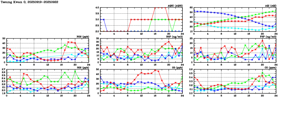 Air Quality Data Time Series in Tseung Kwan O (2025/09/22) | ( Line colors: Day -3 Day -2 Day -1 Current day ) | 2D Map Current AQHI |