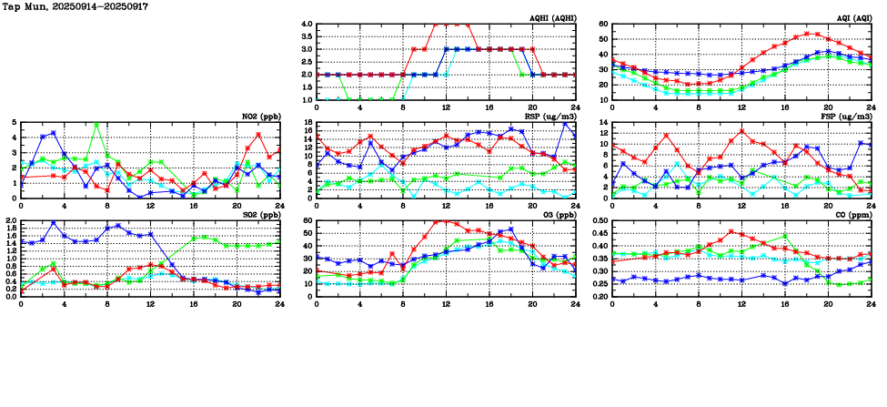 Air Quality Data Time Series in Tap Mun (2025/09/17) | ( Line colors: Day -3 Day -2 Day -1 Current day ) | 2D Map Current AQHI |