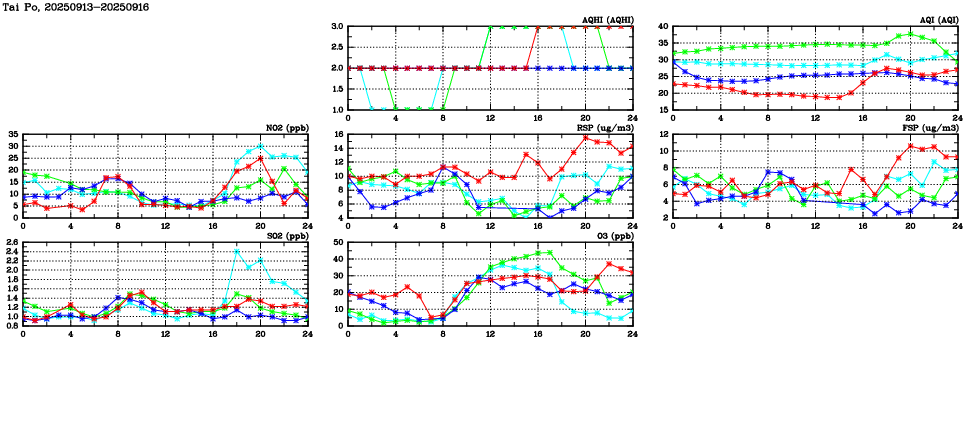Air Quality Data Time Series in Tai Po (2025/09/16) | ( Line colors: Day -3 Day -2 Day -1 Current day ) | 2D Map Current AQHI |