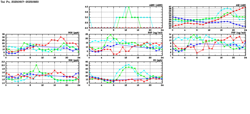 Air Quality Data Time Series in Tai Po (2025/09/20) | ( Line colors: Day -3 Day -2 Day -1 Current day ) | 2D Map Current AQHI |