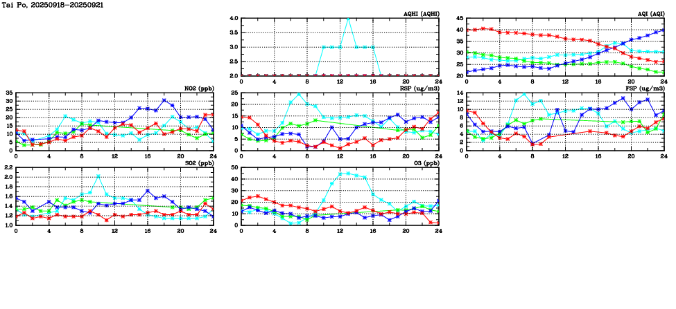 Air Quality Data Time Series in Tai Po (2025/09/21) | ( Line colors: Day -3 Day -2 Day -1 Current day ) | 2D Map Current AQHI |