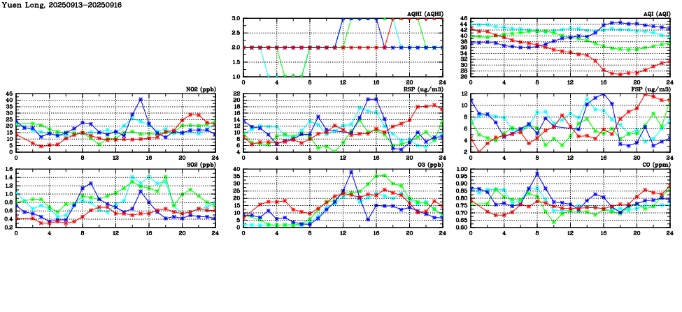 Air Quality Data Time Series in Yuen Long (2025/09/16) | ( Line colors: Day -3 Day -2 Day -1 Current day ) | 2D Map Current AQHI |