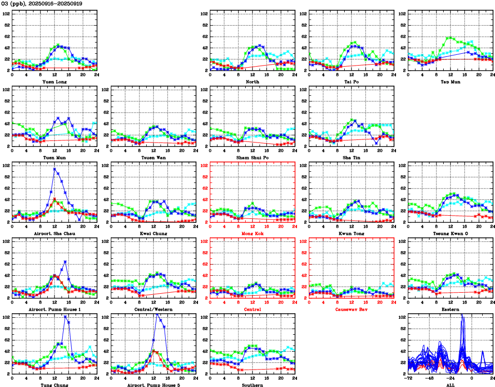 Air Quality Data Time Series for O3 (2025/09/19) | ( Line colors: Day -3 Day -2 Day -1 Current day ) | 2D Map Current AQHI |