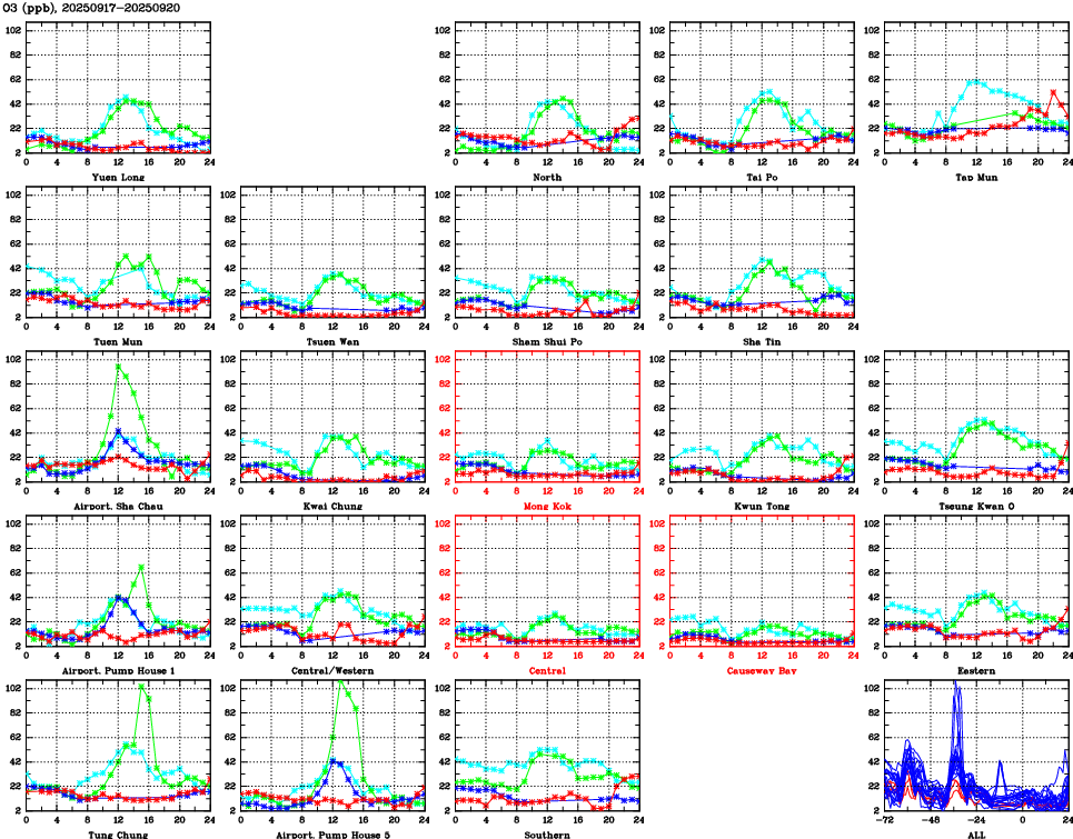 Air Quality Data Time Series for O3 (2025/09/20) | ( Line colors: Day -3 Day -2 Day -1 Current day ) | 2D Map Current AQHI |