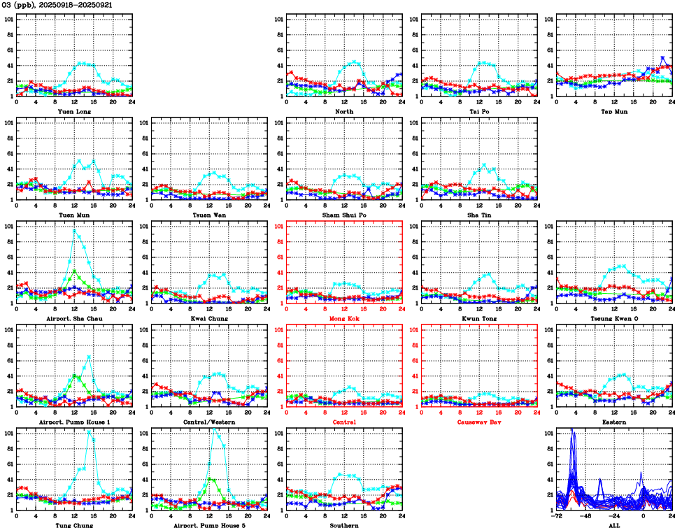 Air Quality Data Time Series for O3 (2025/09/21) | ( Line colors: Day -3 Day -2 Day -1 Current day ) | 2D Map Current AQHI |