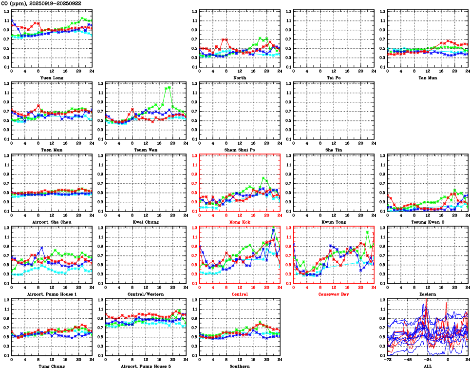 Air Quality Data Time Series for CO (2025/09/22) | ( Line colors: Day -3 Day -2 Day -1 Current day ) | 2D Map Current AQHI |