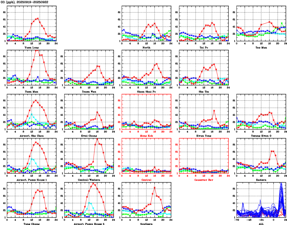 Air Quality Data Time Series for O3 (2025/09/22) | ( Line colors: Day -3 Day -2 Day -1 Current day ) | 2D Map Current AQHI |