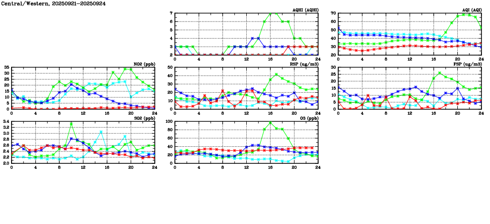 Air Quality Data Time Series in Central/Western (2025/09/24) | ( Line colors: Day -3 Day -2 Day -1 Current day ) | 2D Map Current AQHI |