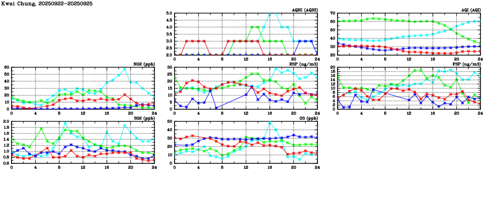 Air Quality Data Time Series in Kwai Chung (2025/09/25) | ( Line colors: Day -3 Day -2 Day -1 Current day ) | 2D Map Current AQHI |