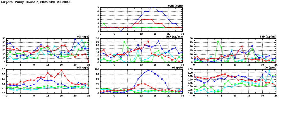 Air Quality Data Time Series in Airport, Pump House 5 (2025/09/23) | ( Line colors: Day -3 Day -2 Day -1 Current day ) | 2D Map Current AQHI |
