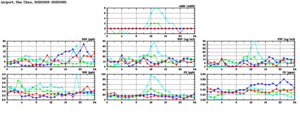 Air Quality Data Time Series in Airport, Sha Chau (2025/09/21) | ( Line colors: Day -3 Day -2 Day -1 Current day ) | 2D Map Current AQHI |