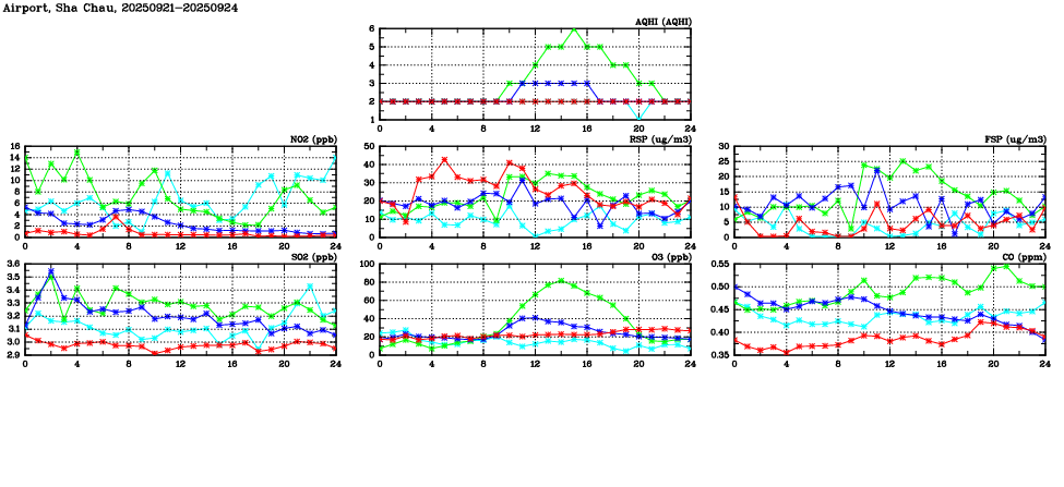 Air Quality Data Time Series in Airport, Sha Chau (2025/09/24) | ( Line colors: Day -3 Day -2 Day -1 Current day ) | 2D Map Current AQHI |
