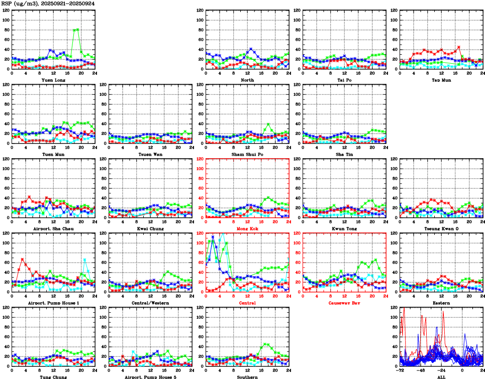 Air Quality Data Time Series for RSP (2025/09/24) | ( Line colors: Day -3 Day -2 Day -1 Current day ) | 2D Map Current AQHI |