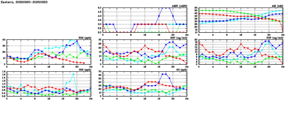 Air Quality Data Time Series in Eastern (2025/09/23) | ( Line colors: Day -3 Day -2 Day -1 Current day ) | 2D Map Current AQHI |