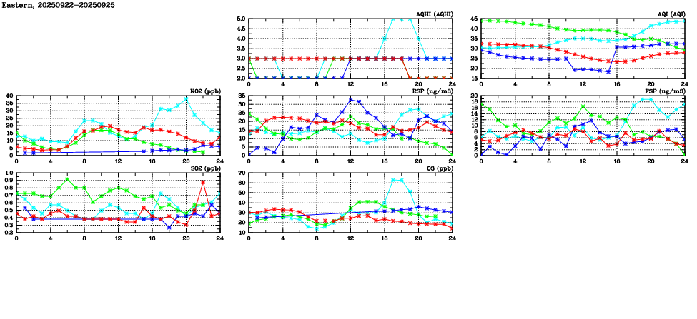 Air Quality Data Time Series in Eastern (2025/09/25) | ( Line colors: Day -3 Day -2 Day -1 Current day ) | 2D Map Current AQHI |