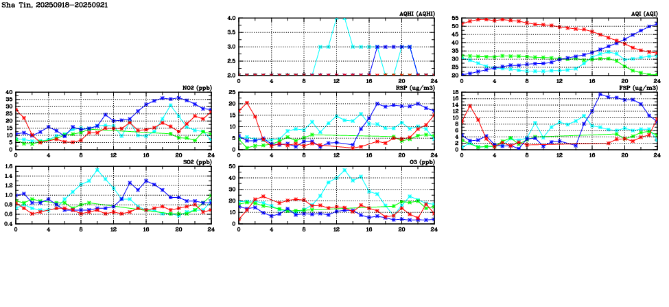 Air Quality Data Time Series in Sha Tin (2025/09/21) | ( Line colors: Day -3 Day -2 Day -1 Current day ) | 2D Map Current AQHI |