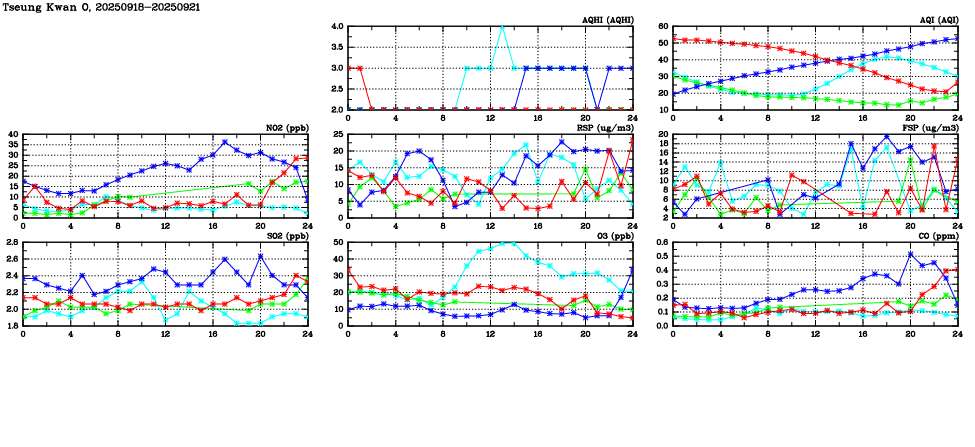 Air Quality Data Time Series in Tseung Kwan O (2025/09/21) | ( Line colors: Day -3 Day -2 Day -1 Current day ) | 2D Map Current AQHI |