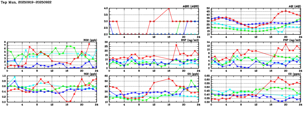 Air Quality Data Time Series in Tap Mun (2025/09/22) | ( Line colors: Day -3 Day -2 Day -1 Current day ) | 2D Map Current AQHI |
