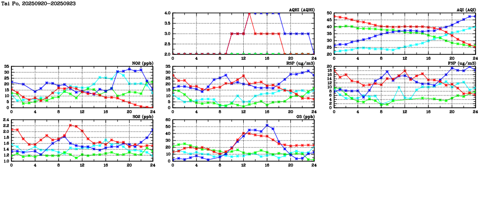 Air Quality Data Time Series in Tai Po (2025/09/23) | ( Line colors: Day -3 Day -2 Day -1 Current day ) | 2D Map Current AQHI |