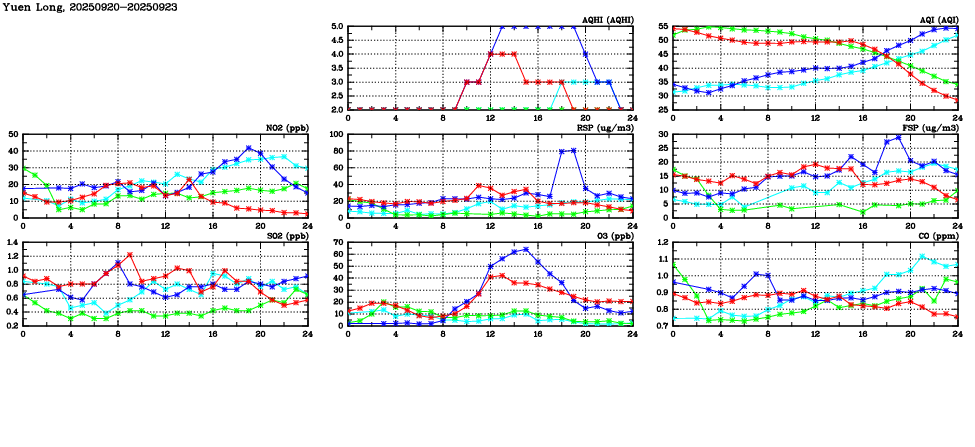 Air Quality Data Time Series in Yuen Long (2025/09/23) | ( Line colors: Day -3 Day -2 Day -1 Current day ) | 2D Map Current AQHI |