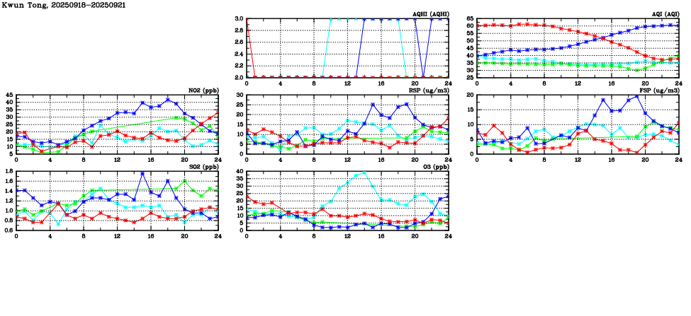 Air Quality Data Time Series in Kwun Tong (2025/09/21) | ( Line colors: Day -3 Day -2 Day -1 Current day ) | 2D Map Current AQHI |