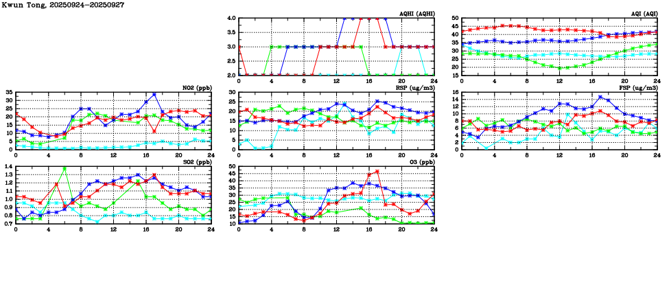 Air Quality Data Time Series in Kwun Tong (2025/09/27) | ( Line colors: Day -3 Day -2 Day -1 Current day ) | 2D Map Current AQHI |