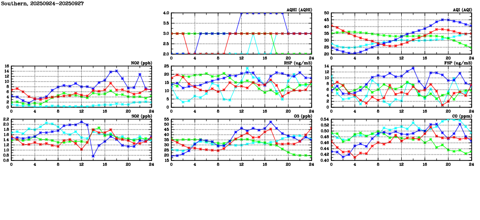 Air Quality Data Time Series in Southern (2025/09/27) | ( Line colors: Day -3 Day -2 Day -1 Current day ) | 2D Map Current AQHI |