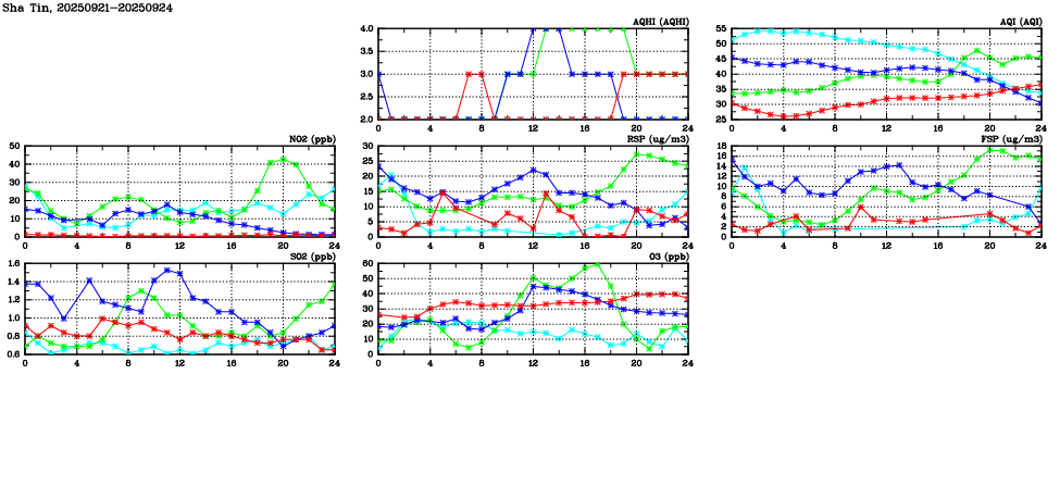 Air Quality Data Time Series in Sha Tin (2025/09/24) | ( Line colors: Day -3 Day -2 Day -1 Current day ) | 2D Map Current AQHI |
