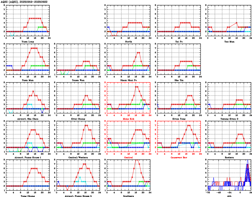 Parameters: | AQHI | AQI | RSP | FSP | NO2 | SO2 | O3 | CO | Temp | WS | WD |