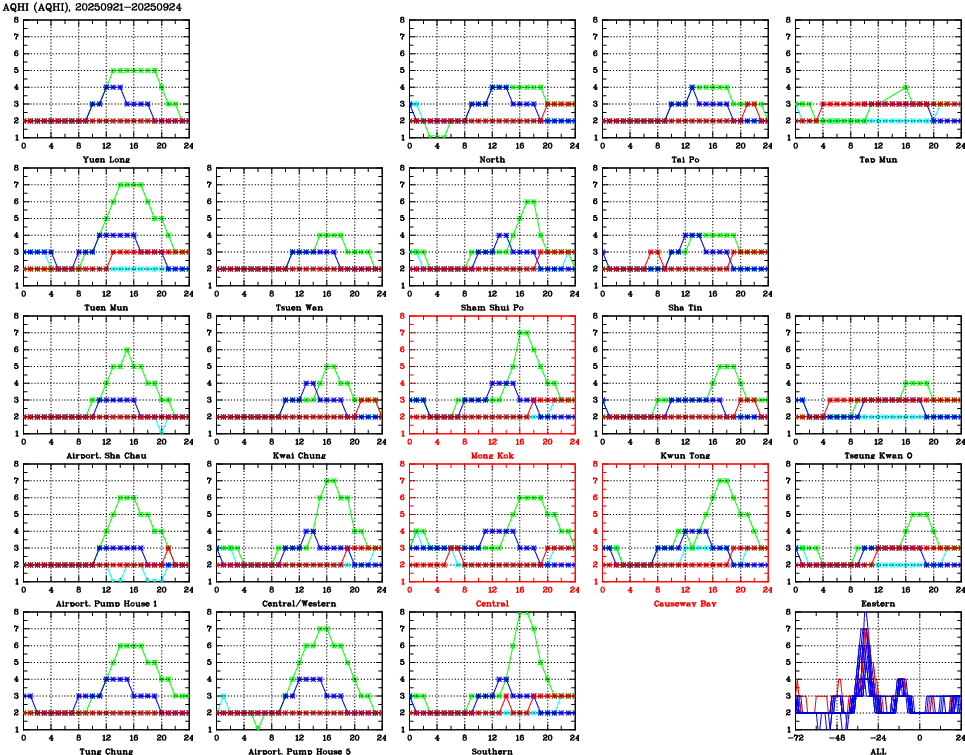 Parameters: | AQHI | AQI | RSP | FSP | NO2 | SO2 | O3 | CO | Temp | WS | WD |