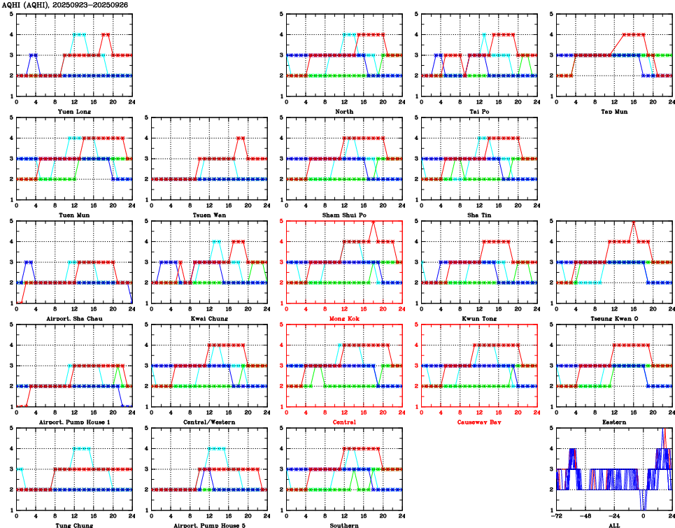 Air Quality Data Time Series for AQHI (2025/09/26) | ( Line colors: Day -3 Day -2 Day -1 Current day ) | 2D Map Current AQHI |