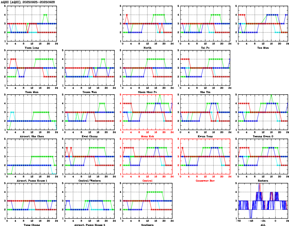 Parameters: | AQHI | AQI | RSP | FSP | NO2 | SO2 | O3 | CO | Temp | WS | WD |