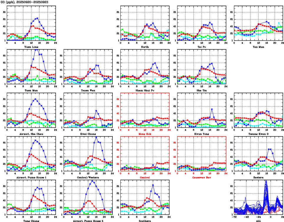 Air Quality Data Time Series for O3 (2025/09/23) | ( Line colors: Day -3 Day -2 Day -1 Current day ) | 2D Map Current AQHI |